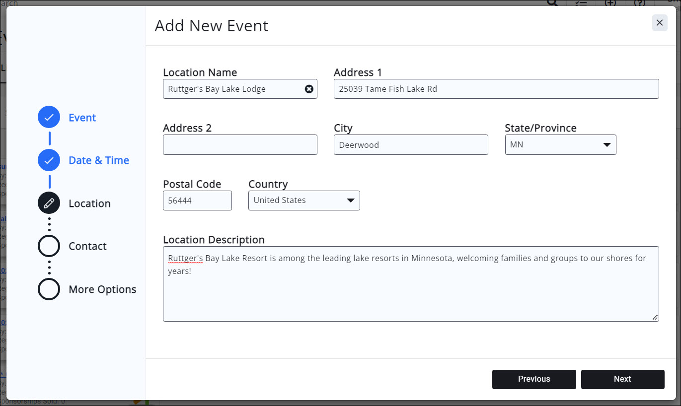 - If you have previously used this location in an event, a drop-down selector will allow you to choose a previously entered location, and will auto-fill all the previously entered fields for address, phone, etc.