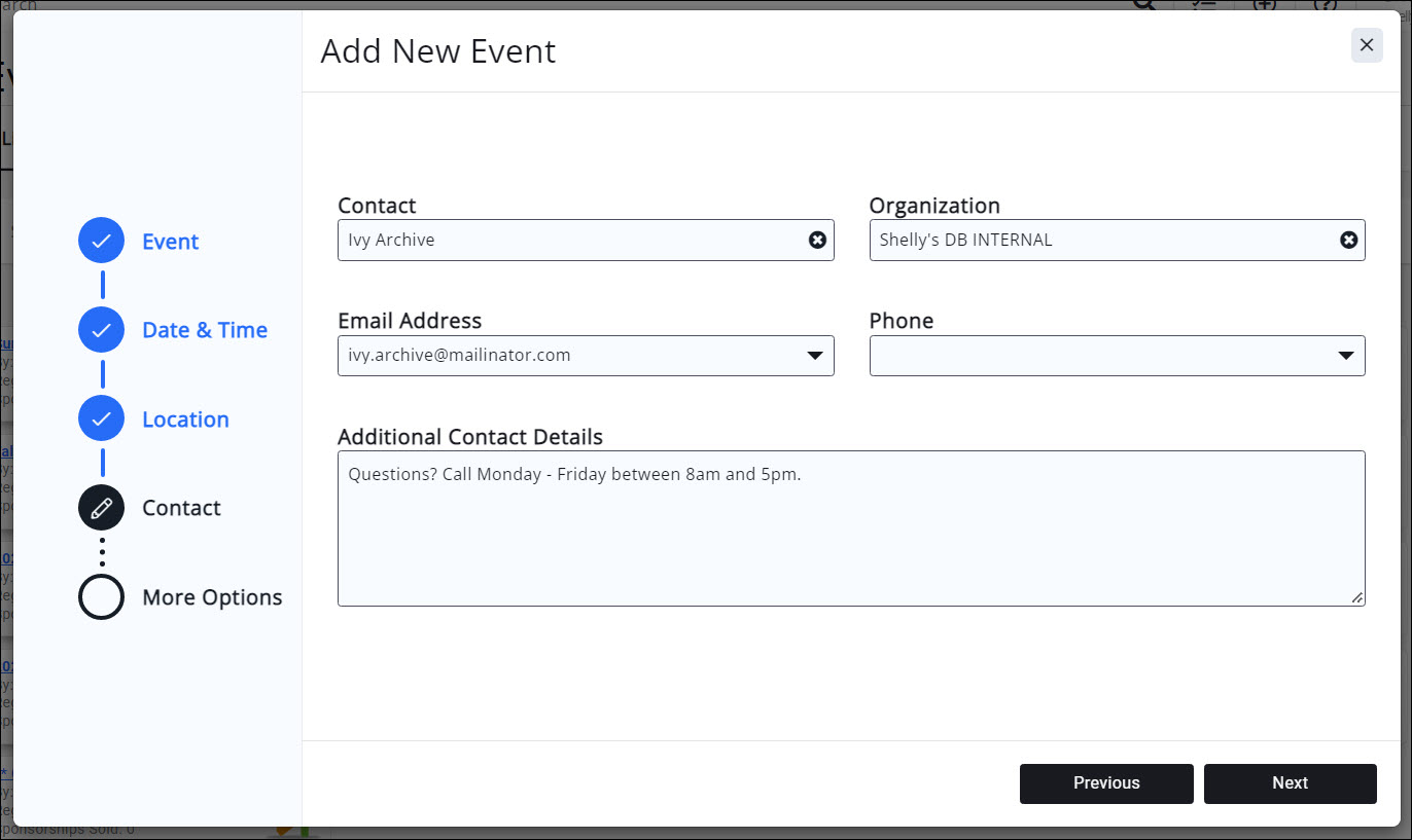 - The wizard will display the contact information for the previous event by default; edit the contact listed if needed. (OPTIONAL)