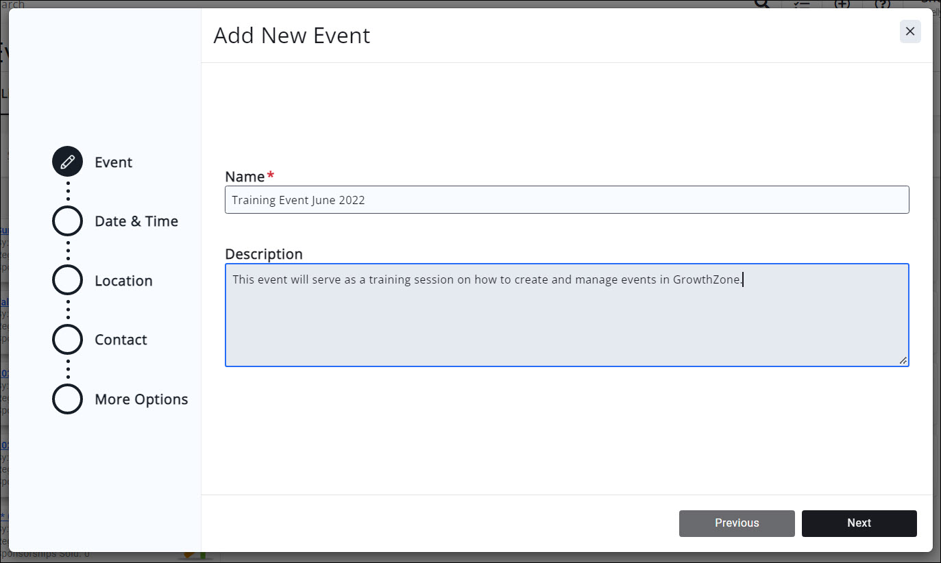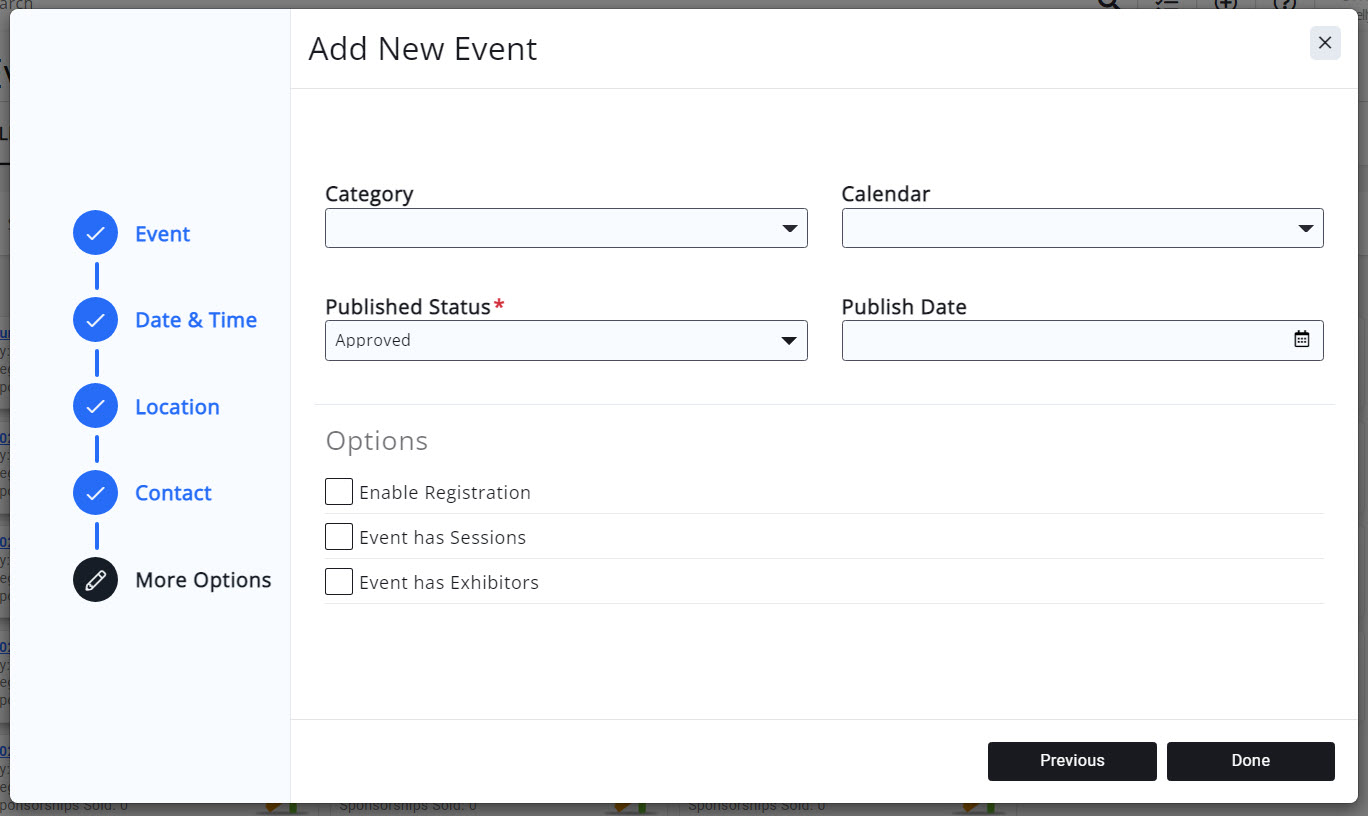- From the Events Module, select the "Add New Event" button to open the "Add New Event" wizard.