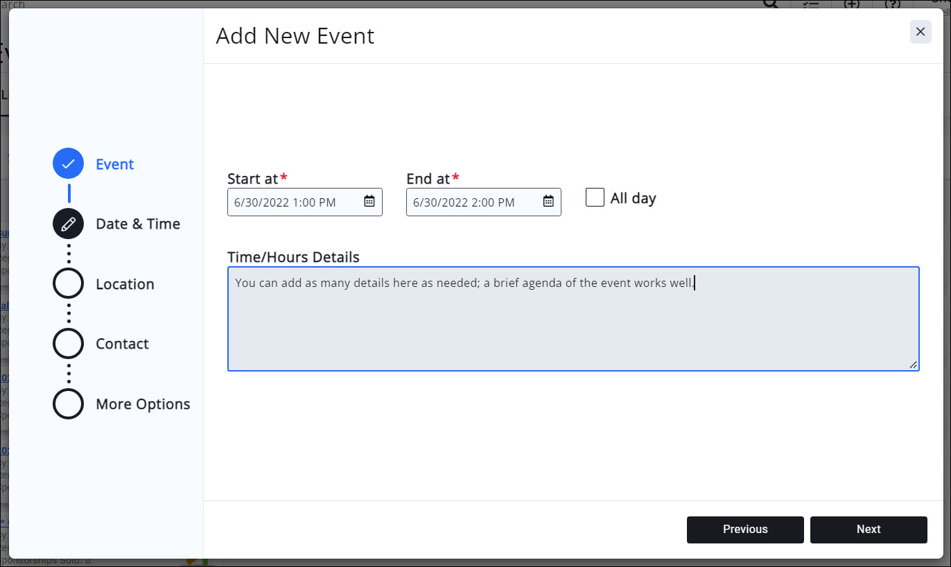 - Description: (OPTIONAL) Be default, the Description field will contain a copy of the previous event's description. Edit this if needed or leave it to edit later.