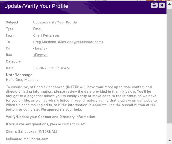 Make it easy for your contacts to keep their own contact and directory information up to date. On the Contacts module main page, you have the ability to send a Member Profile Update email to selected contacts. Within this email is a link that will take the contact to a page where they can review and change their information. This option does not require the contact to access the Info Hub.