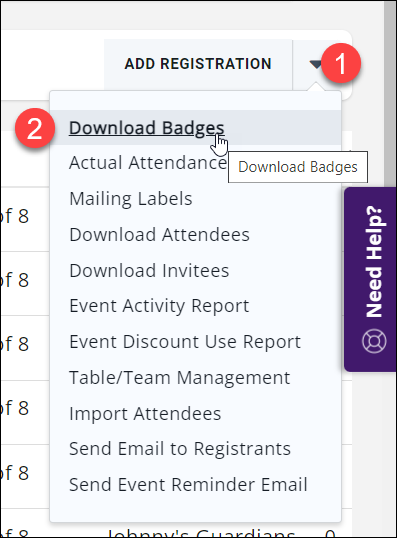 - Click on the down arrow next to the Add Registration button and select Download Badges.