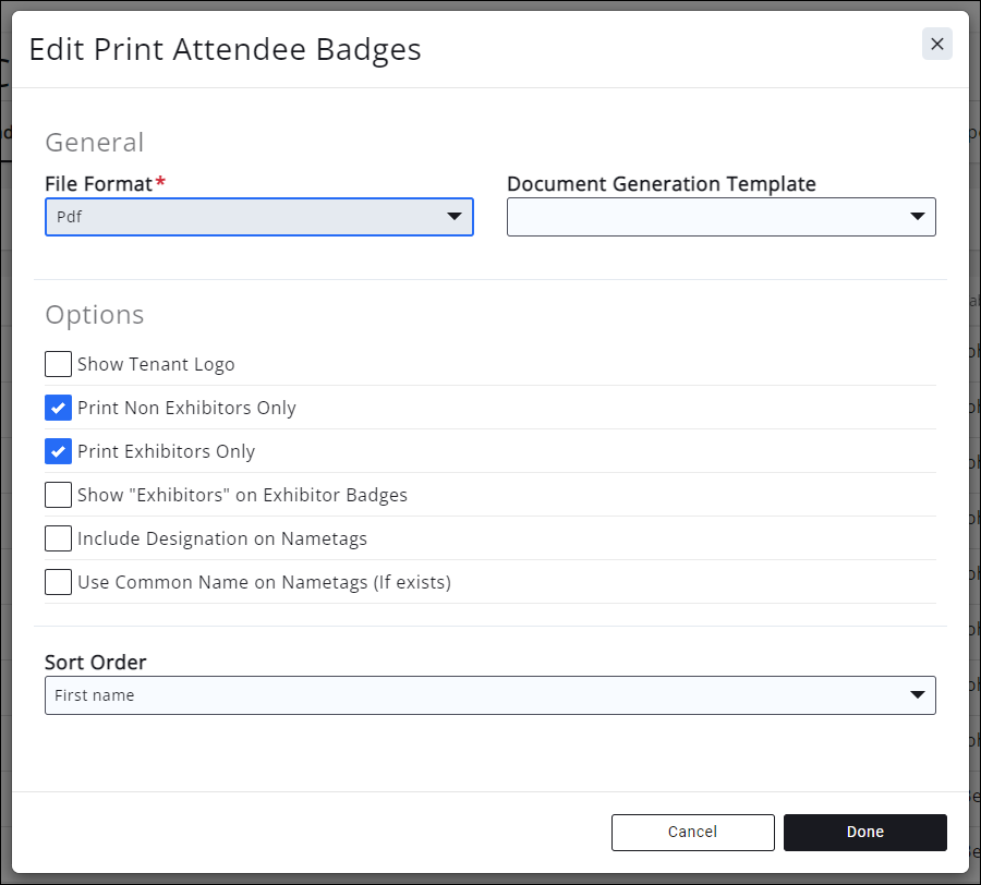 - In the Edit Event Attendee Badges Print window that appears select your preferred options.