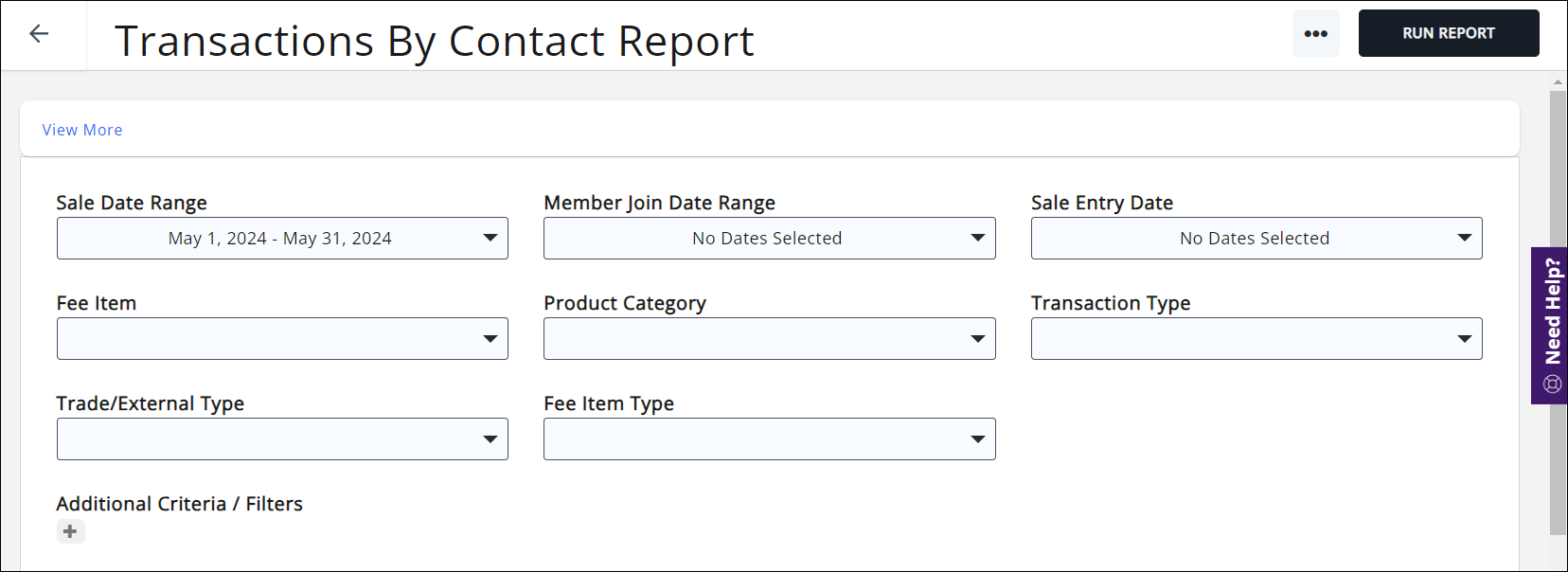 - (Optional): Enter additional Criteria/Filters. For example, if you wish to view transactions for an individual contact, choose Name and enter the desired contact name, as shown below.