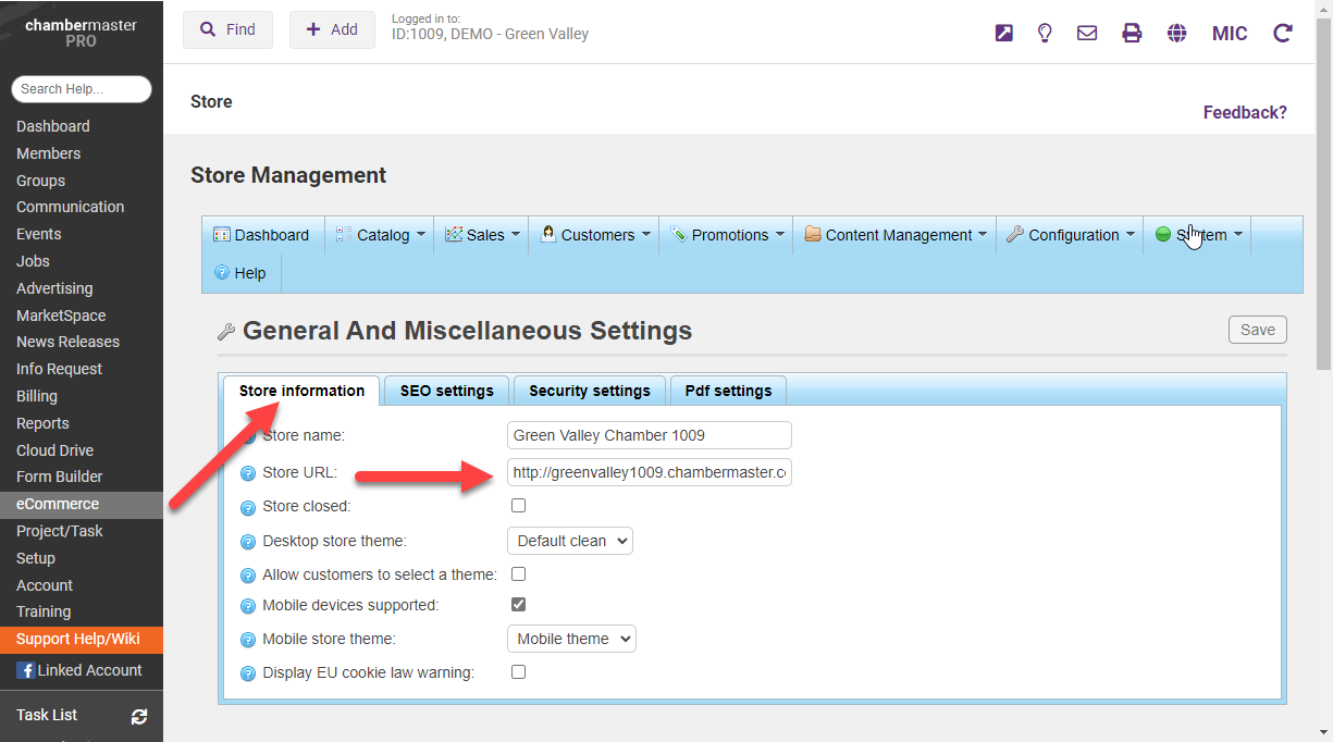 Navigate to CM/MZ > eCommerce > CONFIGURATION > SETTINGS > GENERAL > STORE SETTINGS and paste the URL of the subdomain, including the trailing slash, in the STORE URL field, e.g., http://greenvalley1009.chambermaster.com/ and select SAVE from the top right of the section.