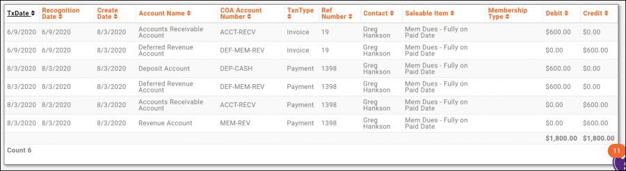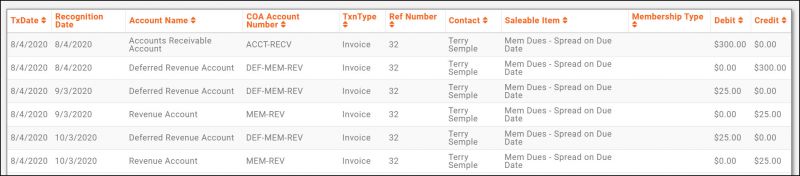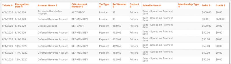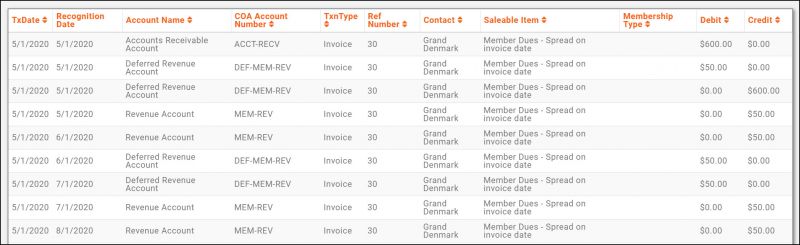 For membership dues, even though a payment may be received, up front for the entire year, you may wish to recognize revenue equally across a specific period (generally 12 months). Spread Monthly on Invoice Date allows you to spread equal portions of a payment, across a selected time frame, starting from the invoice date.