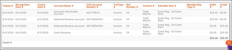 If Fully on Event Start Date is selected, revenue will not be credited to the assigned revenue account until the day of the event. The Deferred Revenue account will be credited to “hold” the funds until the event start date and the A/R account will be debited. On the day the event starts, the Deferred A/R account will be debited, and the income will be credited to the event revenue account.
