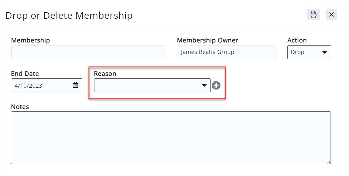 You will choose a drop reason when you drop a membership. See Drop a Membership.