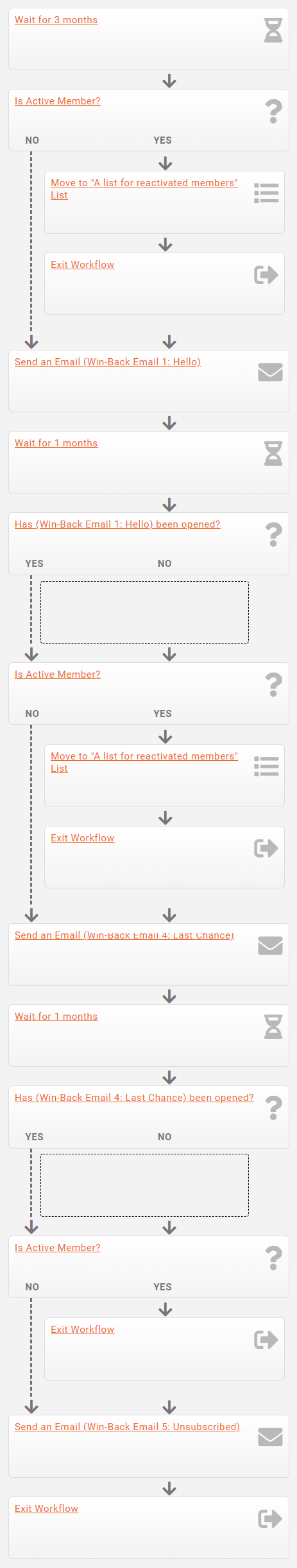 - If they are now Active, move the member to a different list ("Move to List" step) and exit the workflow ("Exit Workflow" step).