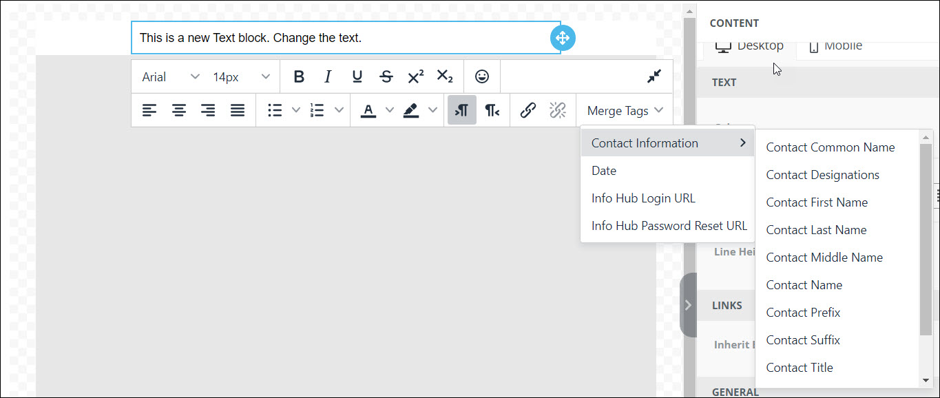 | The Text tool allows you to add the text block to your newsletter. Simply drag and drop the block into your newsletter, and type your text. Standard word processing functions are available, such as font type, font size, font styling- bold, italic, underline, and so on- and others . The ability to insert merge tags allows for further customization, such as adding today's date, the Info Hub login URL, etc. |