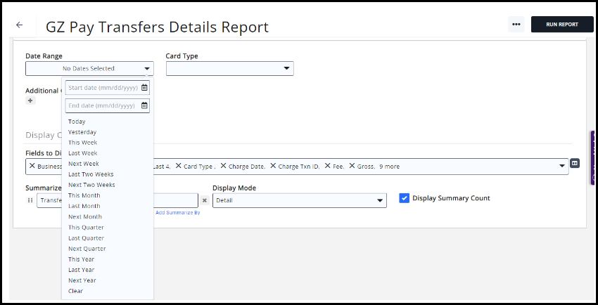 - Choose the GZ Pay Transfer Details Report from the Billing module reports overview.