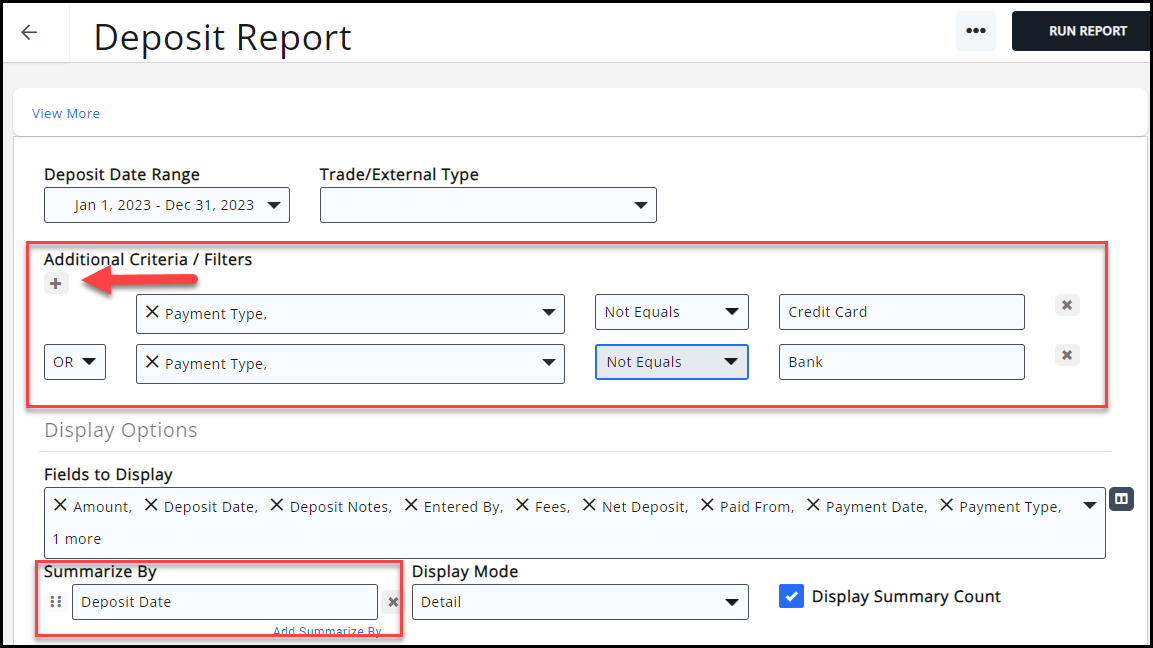 to apply an Additional Criteria/Filter: Choose OR, add of Payment Type > Not Equals > Bank. These parameters eliminate the credit card and ACH payments from the report.
