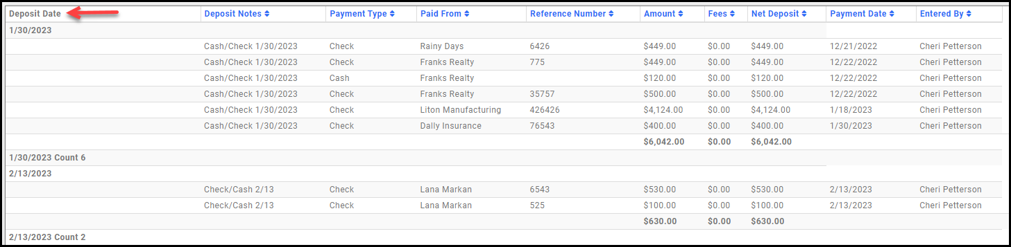 - Compare the report to your bank statement by highlighting the deposits from one to the other. The Deposit Date should be the date the checks/cash were taken to the bank and recorded in GrowthZone.
