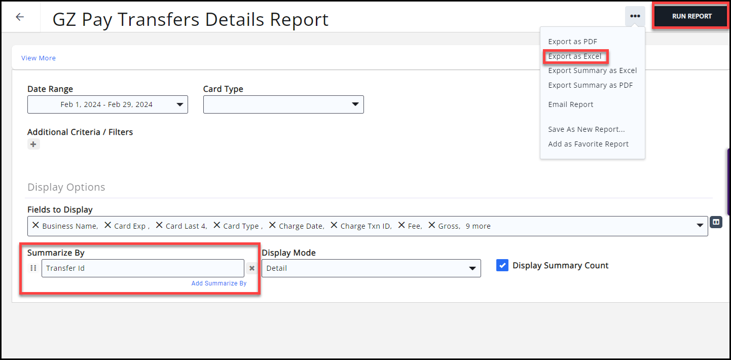 - Apply Summarize by Transfer ID in the Display Options. This is an important display because more than one transfer may occur in a day.