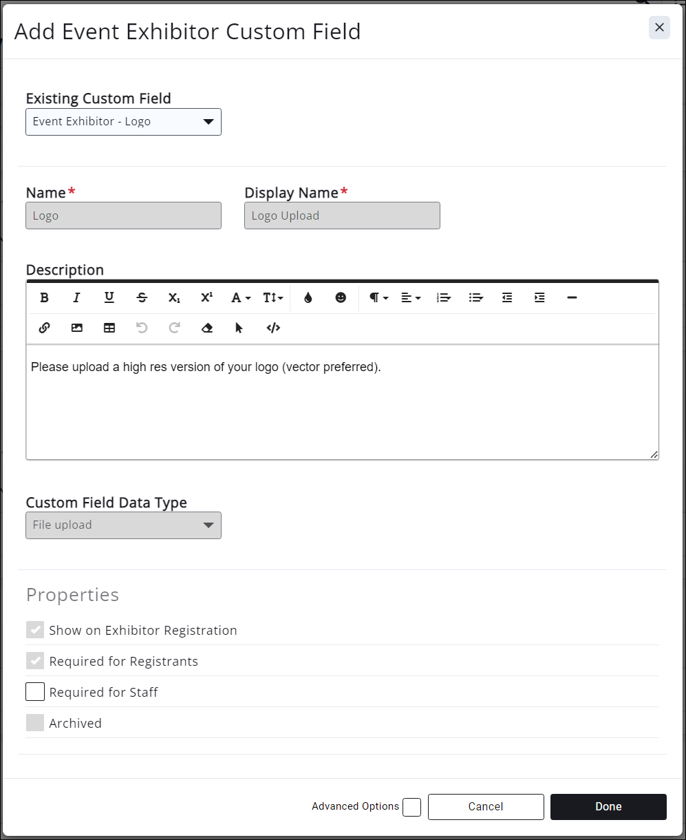 - Display Name: this is what will display out on the exhibitor registration form. (Required if adding a new custom field)