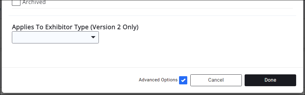 - Click Advanced Options to display the Applies to Exhibitor Type (Version 2 Only) option. This allows you to restrict the custom field to a specific exhibitor registration type if needed. (Optional)