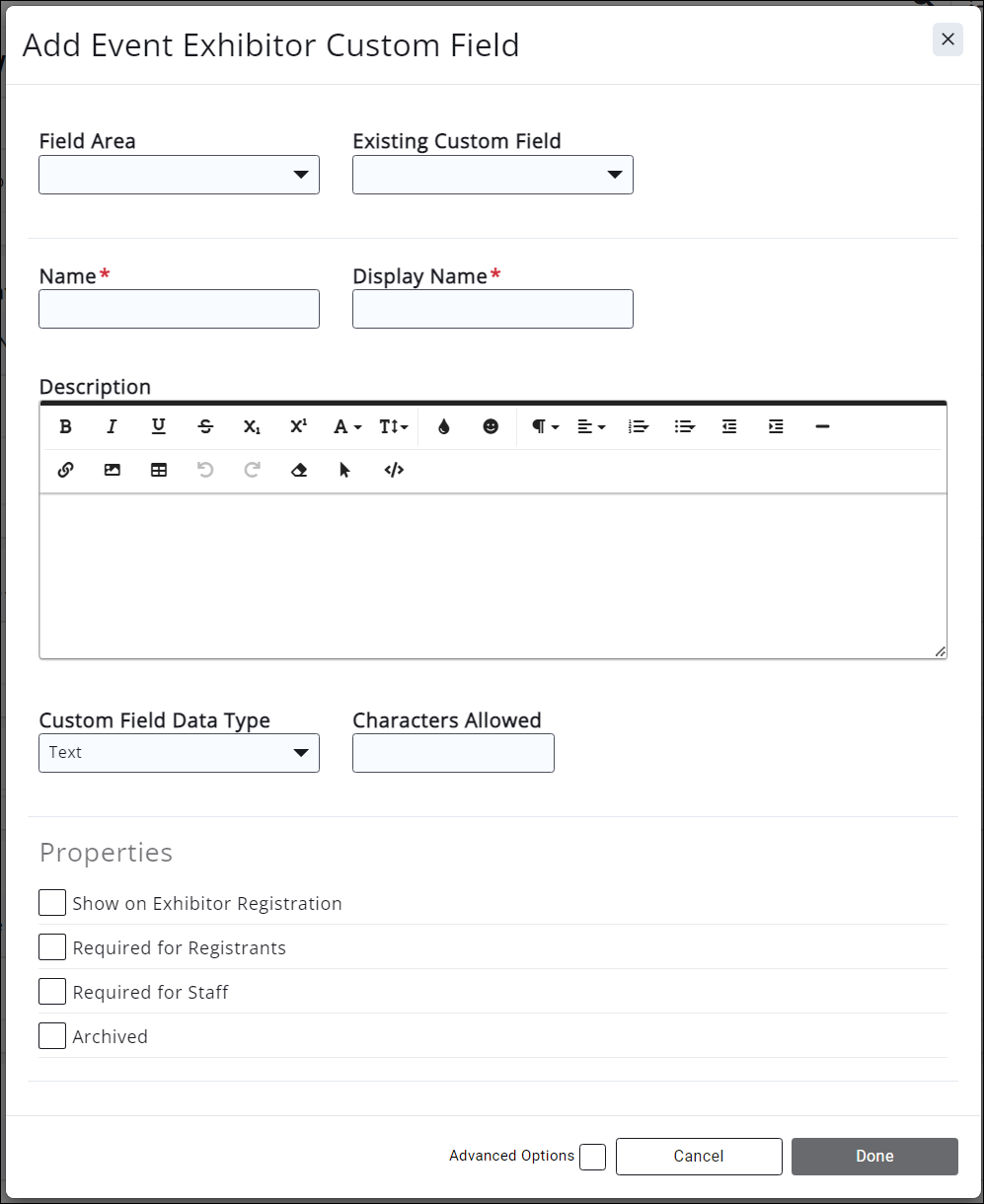 Existing Custom Field: if you are using an existing custom field, make your selection here. (NOTE: only existing custom fields of type Event Exhibitor are available to select.) Selecting an existing field will remove the "Field Area" option from the window and will populate the remainder of the fields with the selected field's properties , greying out any changes to the options as shown below: