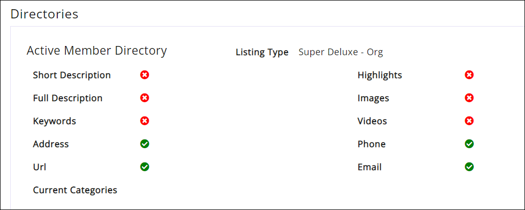 - The Directories section, displays what information the member has populated within your on-line directory, and provides an indication of whether the member is taking full advantage of opportunities for exposure. If no directories are assigned, No directories assigned/applicable will be displayed.
