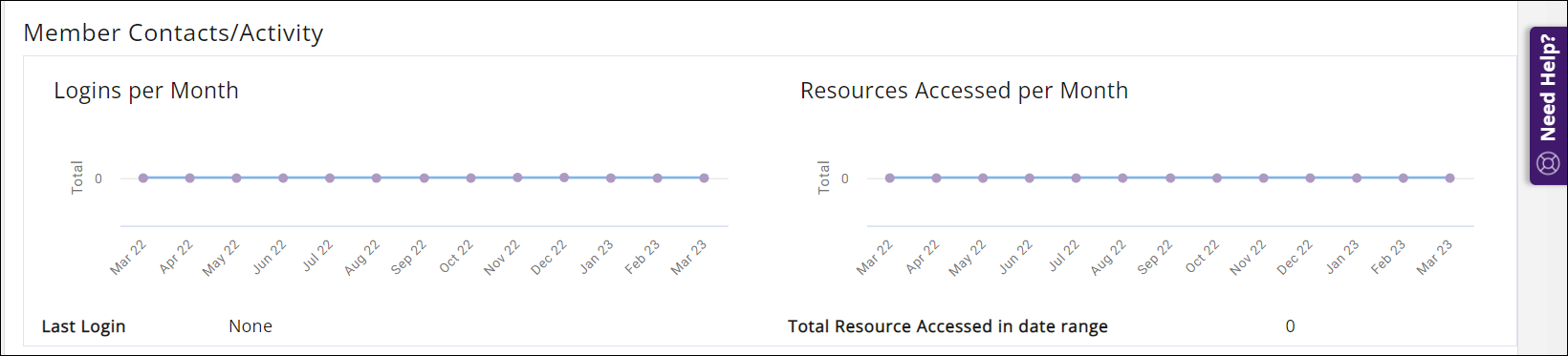- The Member Contacts/Activity section shows graphically how frequently your members are logging into the InfoHub, which provides you with an understanding of whether this member is taking advantage of the InfoHub resource. If you are looking at an organization engagement tab, this shows member logins for all contacts under the membership by month. If you are looking at an individual contact tab, this will display history of that individual contact's logins.
