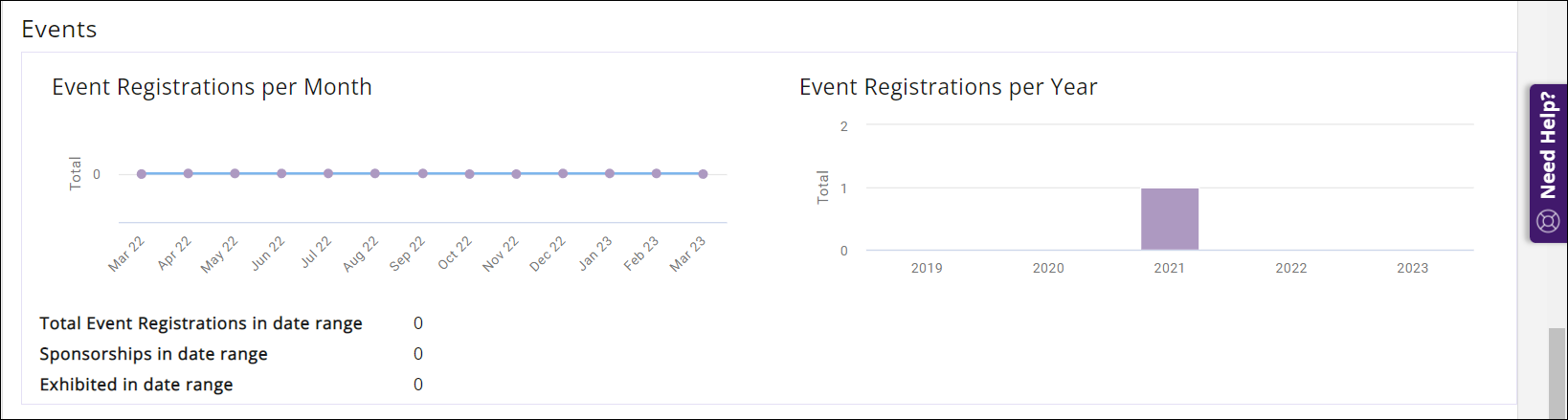 - The Events section provides a metric of the number of event registration for each month, in the selected date range, as well as event registration comparison, year over year. By dwelling your mouse over the graph, you can see further count of event registrations.