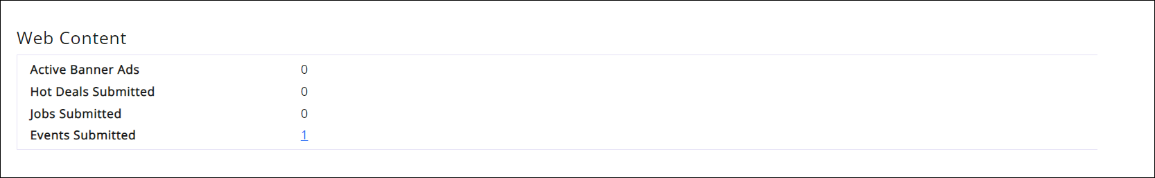 - The Web Content section displays a list of web content opportunities, and the number of content items this member has submitted. The numbered links may be clicked to view a list of the web content items submitted. NOTE: This section will only be displayed if you have purchased the Web Content module.