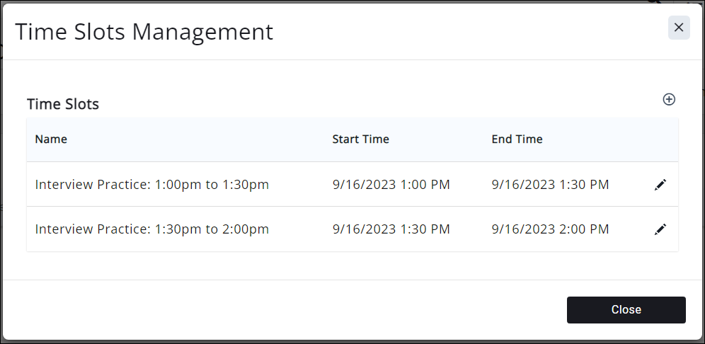 Depending on your needs, a timeslot can be a whole day, or could be specific times within a day. For example, if you have an event where applicants can practice their interviews and you have three rooms (A, B, and C) to hold interviews, with three interviews happening every half hour between 1:00pm and 2:00pm, you would create 2 timeslots and three sessions per timeslot.