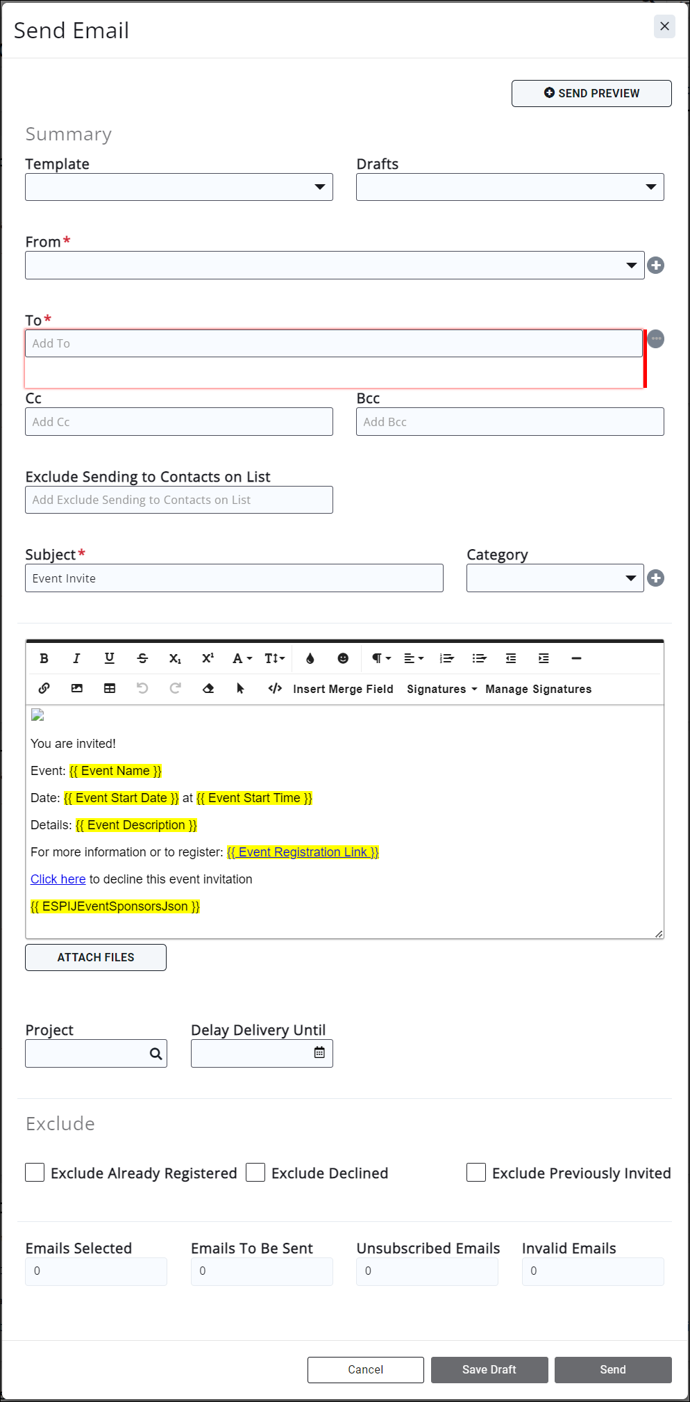 If you have previously sent an Event Invite, you can select to Exclude Already Registered (if a contact has already registered for the event), Exclude Declined (if a contact declined the previous invitation), and/or Exclude Previously Invited (if the contact has already received an invitation).