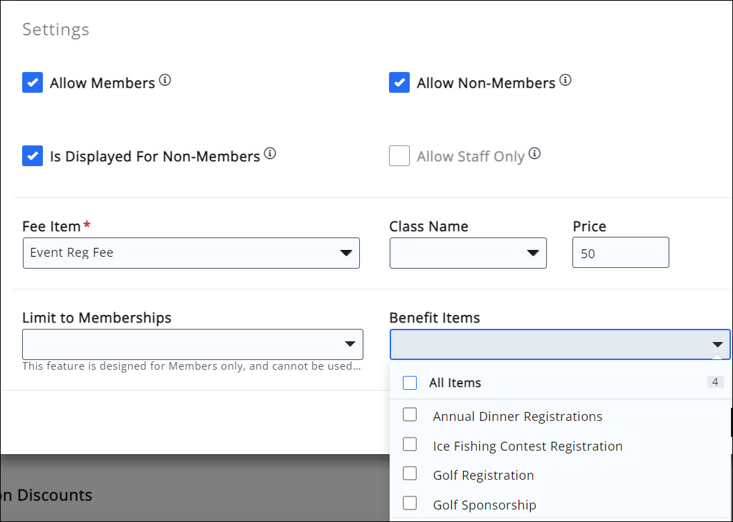 When you create registration types (see Setup Event Registration Fees), you will have the option to select the Benefit Item to be tied to a registration fee. You are able to choose multiple benefit items for one registration type. For example, you may have one membership that receives a free registration where as another may get 50% off.