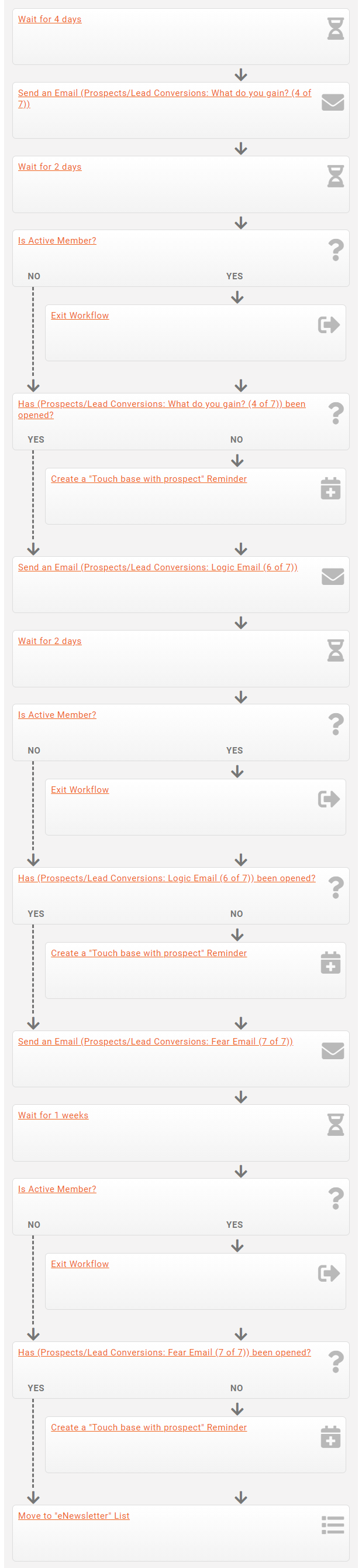This workflow actually works in tandem with the Prospect Development workflow. It uses the same source list and sends different messaging intended to convert the prospect into an actual lead.