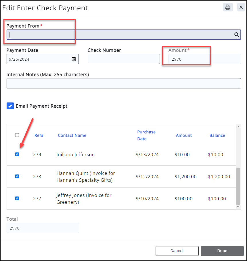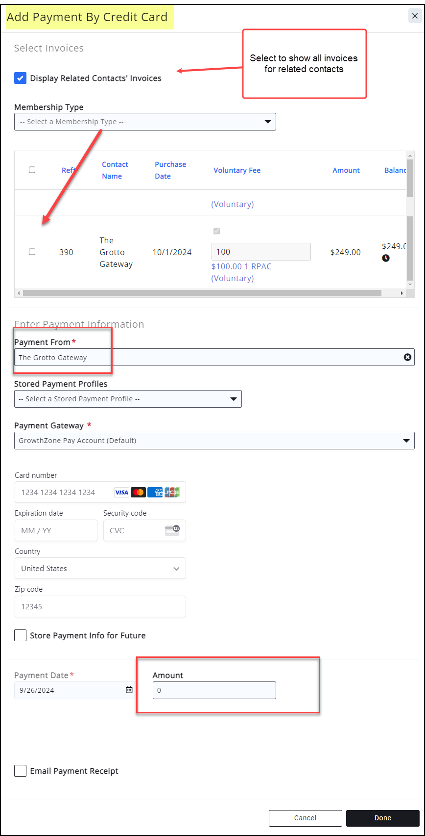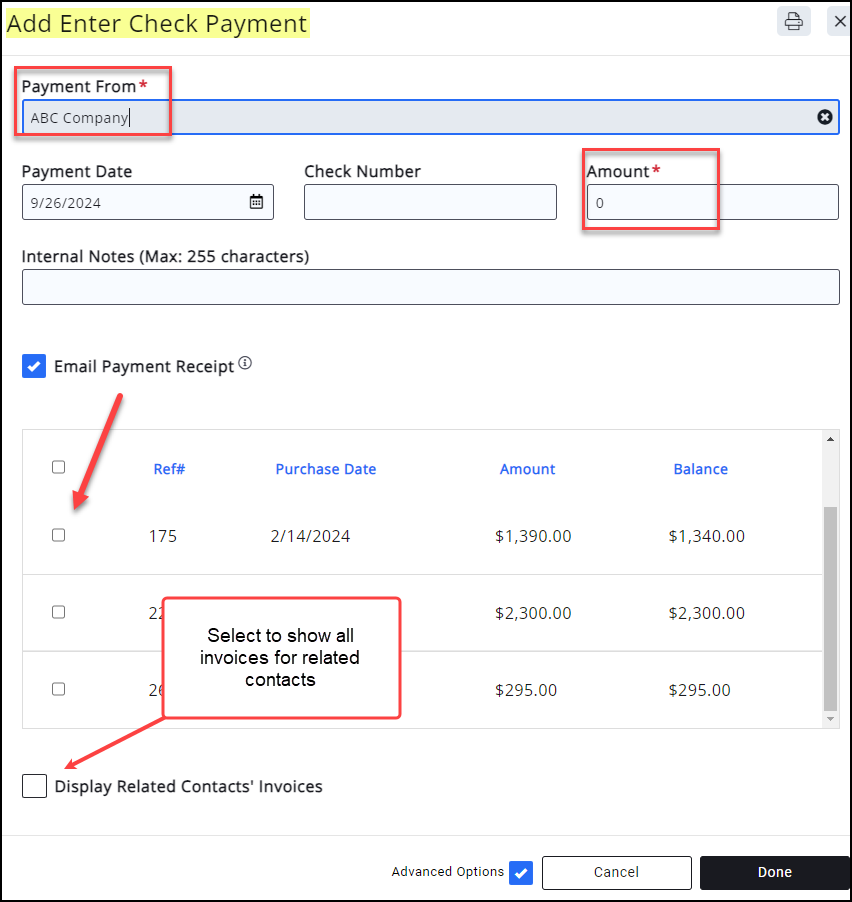 - Enter Payment (check or credit card). Cash payments will only show the specific contact's invoices and no related invoices.