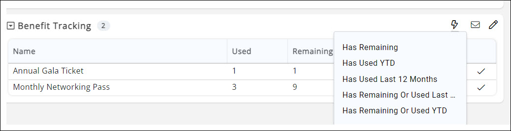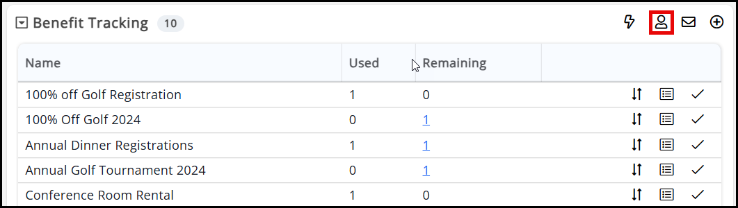 - Track the usage of a benefit by clicking the record usage check mark. You can also track the usage of a benefit by looking at the Remaining column under Benefit Tracking.