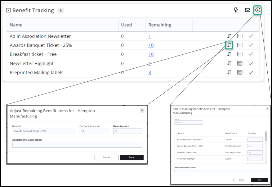 - You can also click the Plus icon to see the Edit Remaining Benefit Items screen. This is an additional area to adjust individual remaining benefits and add new benefits. See Adjust Membership Benefits in the Benefit Tracking - Getting Started article more information on this feature.
