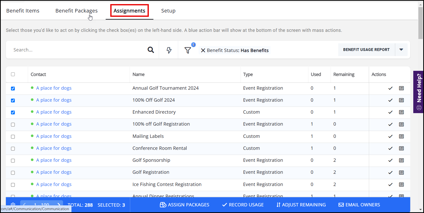 If the use of a benefit item is all on the same date, for the same quantity and description, you can record the use for multiple contacts in mass.