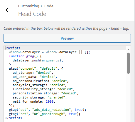 Additional CookieYes code is in the "head code" section of Customizer as follows and needs to remain in place.