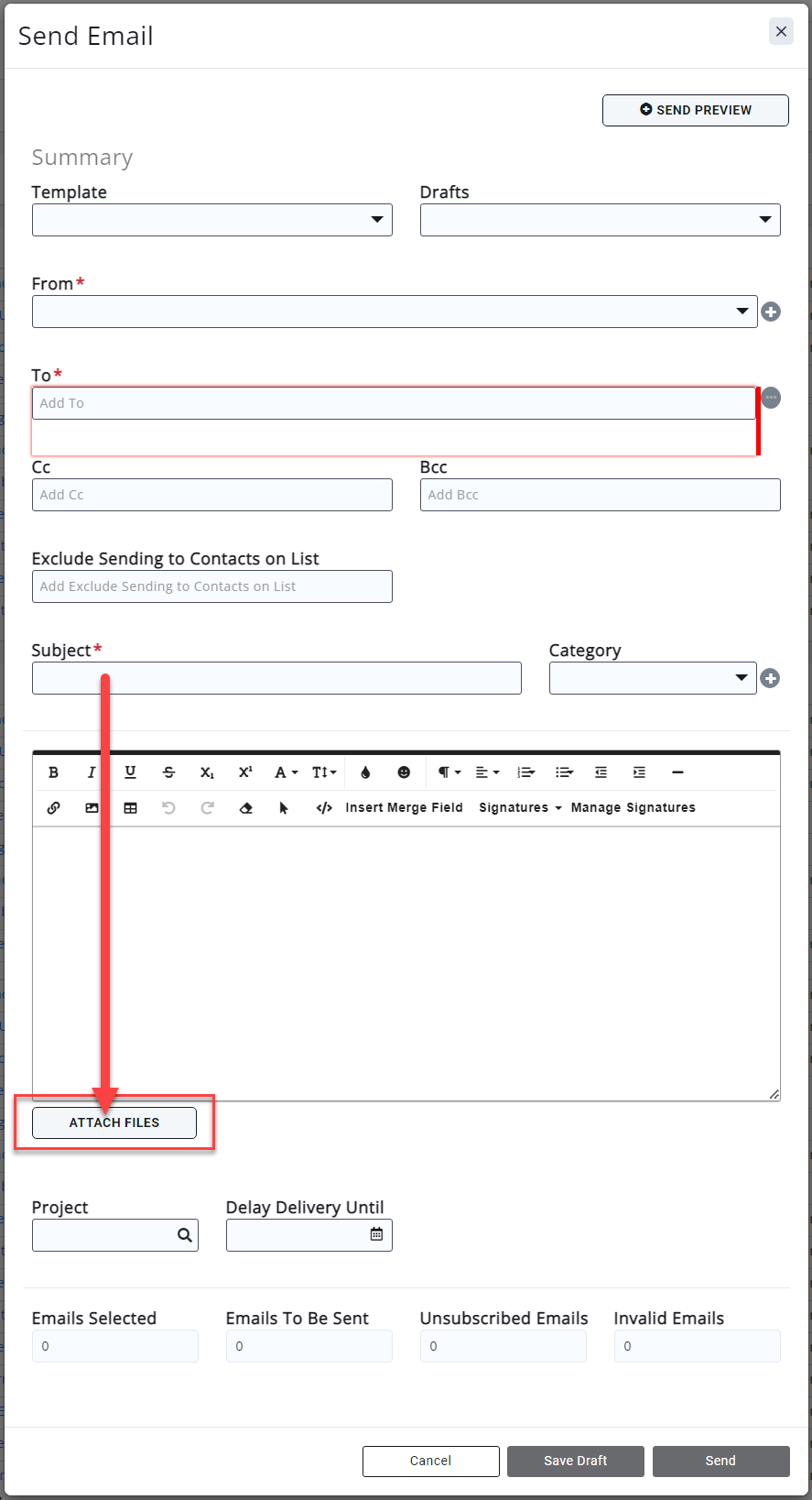 If you do need to attach a file to an email, in the Send Email window is an option to attach a file. Please keep in mind the file type and size may affect the deliverability of your email.