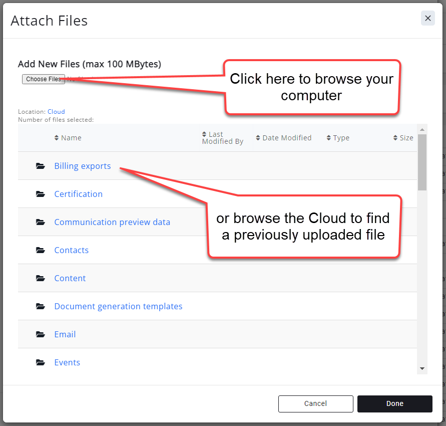 Choosing a file from your computer will upload it to the folder you have open in the Cloud, and will automatically select that file for attachment.