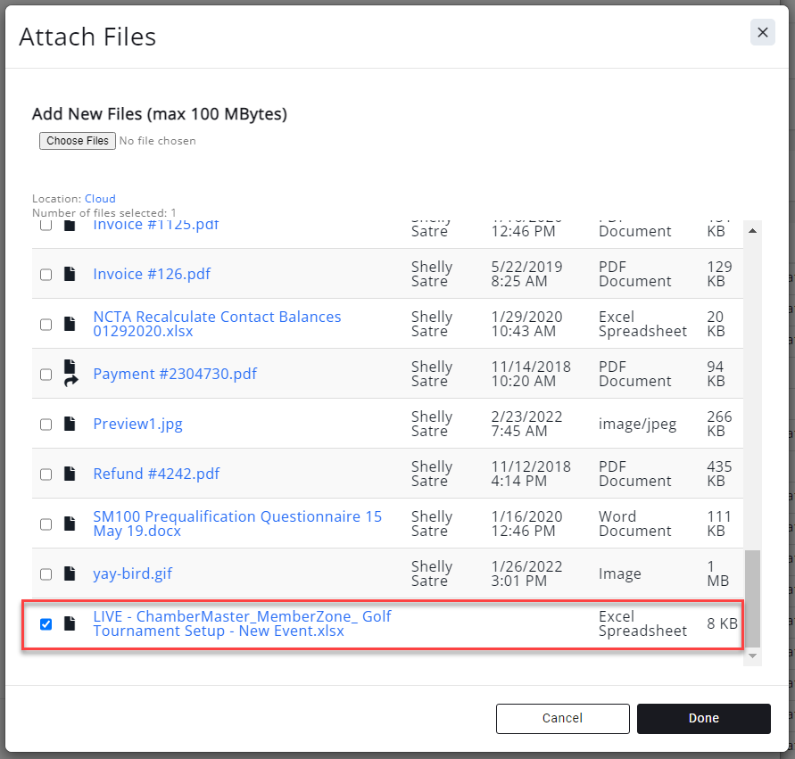 Clicking the Attach Files button will open the Attach Files window. Be default it will open the GrowthZone Cloud, where you can find a file you have previously uploaded, OR you can click the Choose Files button to browse your computer for the file.