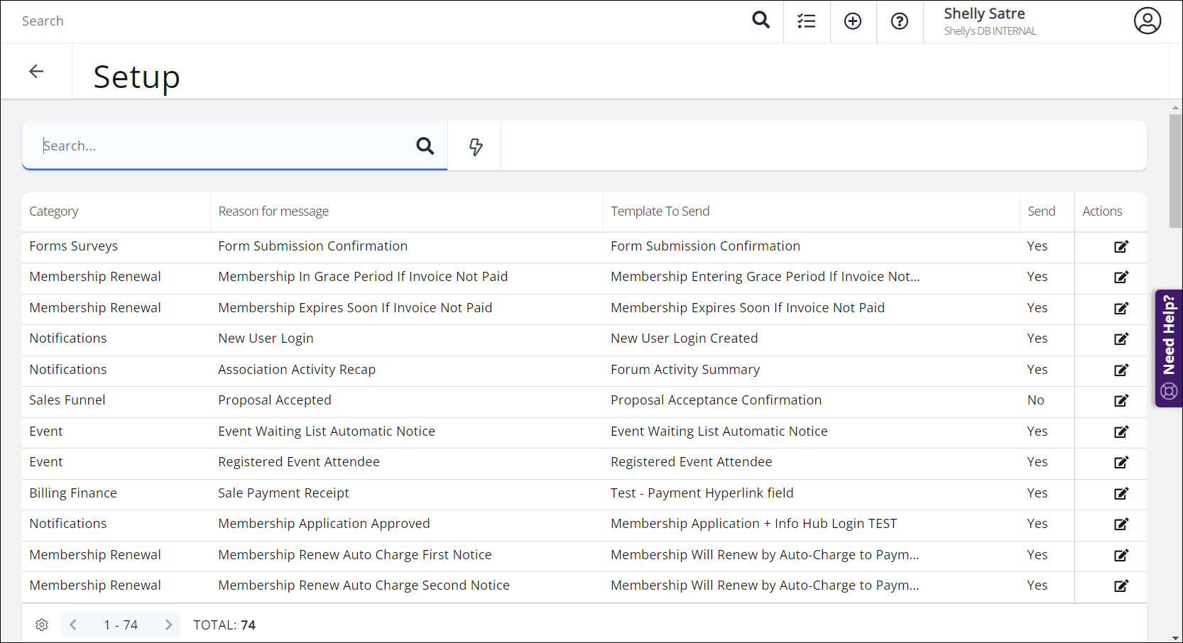 - In the Communications section, click Automated Messaging. A list of the available options for automated messages is displayed. See table below for further details. The category of the automated message is displayed along with the event that triggers the message to be sent, the selected email template of the message, whether the message is enabled to be sent, and an edit option.