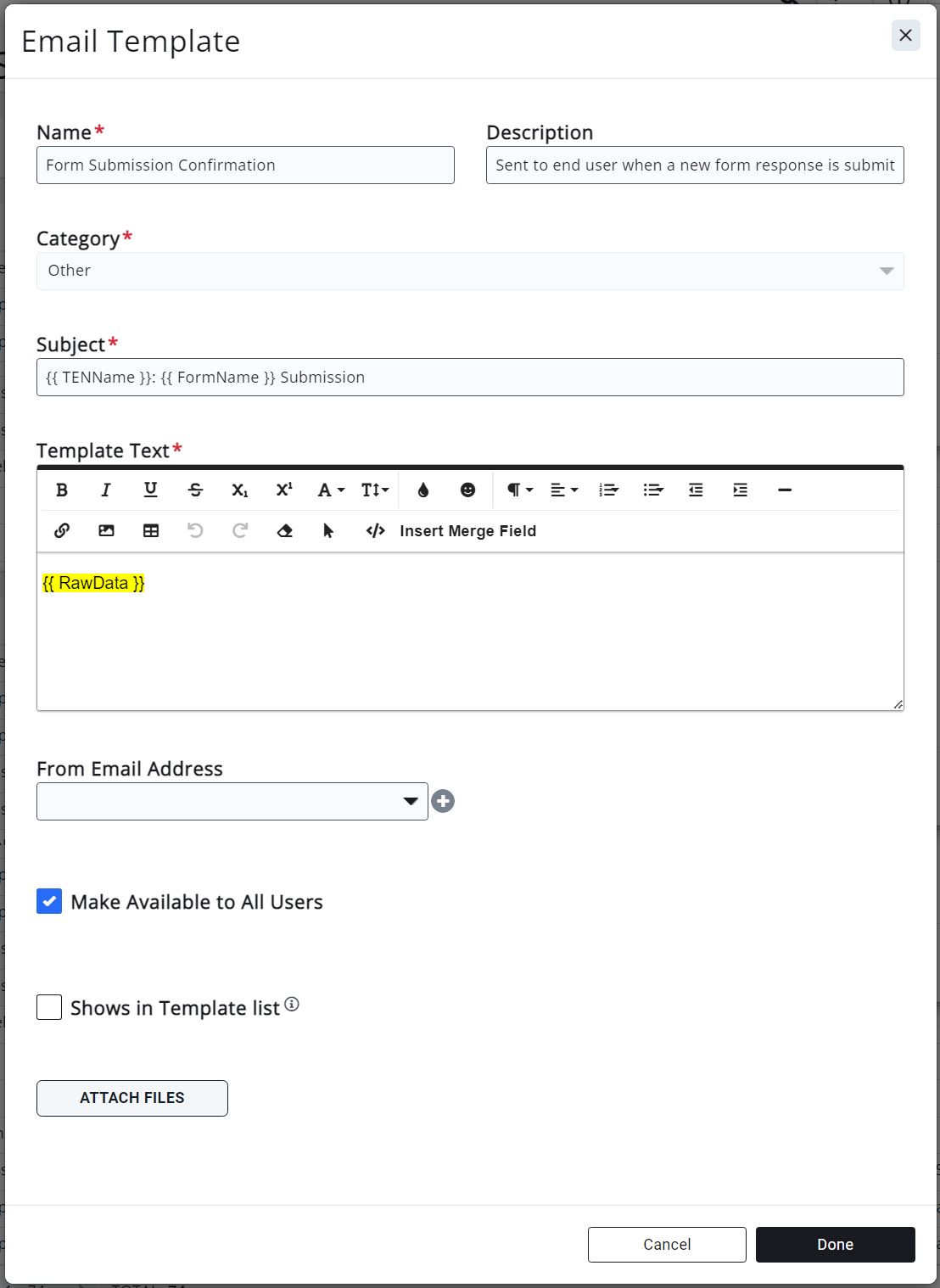 | New Form Response | None | This notification is sent to the individual(s) identified to receive form Response Notifications for a form. |