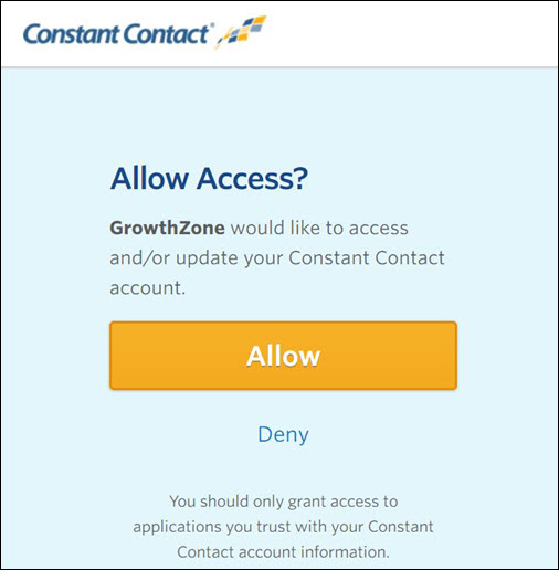 - Click Allow on the Allow Access screen. This process authorizes the connection between GrowthZone and Constant Contact. Once completed, you will see the ConstantContact status updated to Connected.