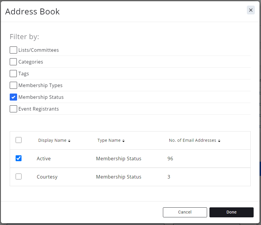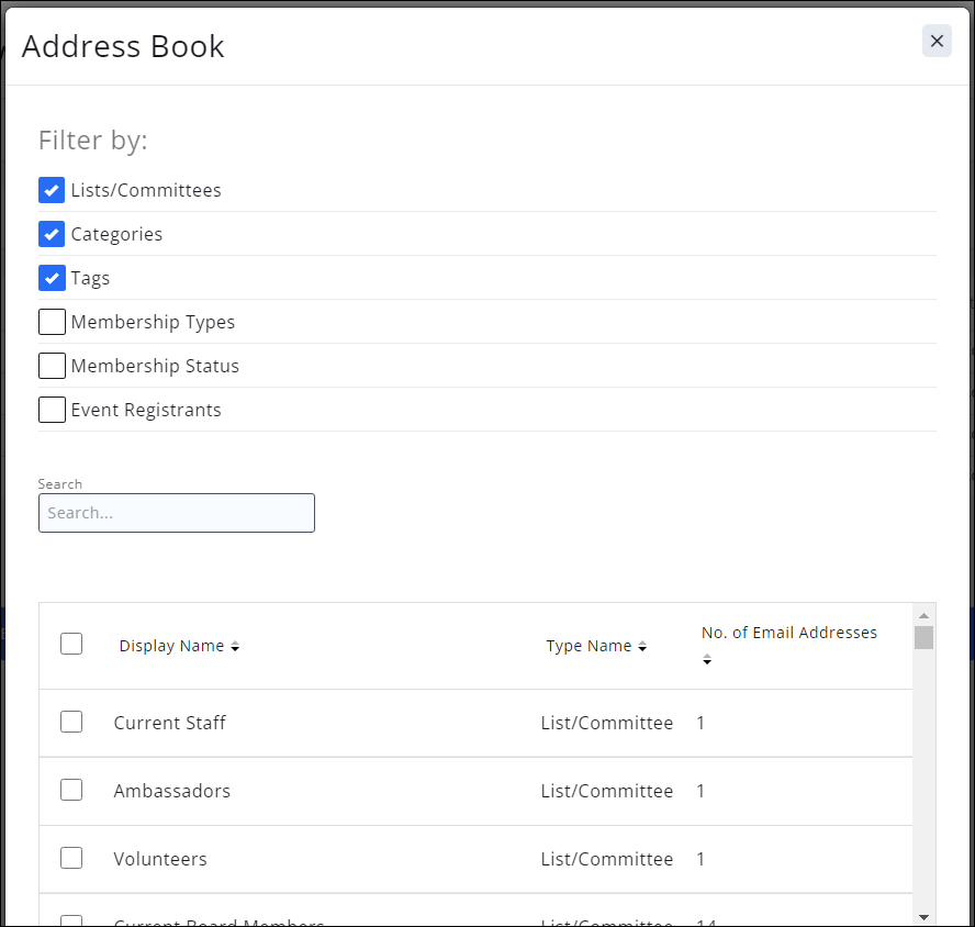 GrowthZone provides you with an Address Book where lists/committees that you have created and dynamically created grouping have been created. For example, the system has dynamically created a group of all of your active members. Other dynamically created groups include member categories, event registrants, event attendees, event sponsors, etc.