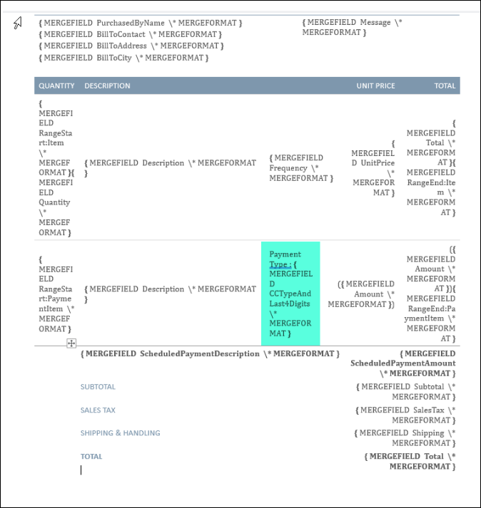 When using merge fields on invoices, the system will look to the invoice(s) for the appropriate information to be included via merge fields. Many of the fields are included on the default invoice. Other fields may be added manually by editing the invoice. The table below describes the fields available for invoice templates; if there is an *, see the Notes below the table for special instructions.