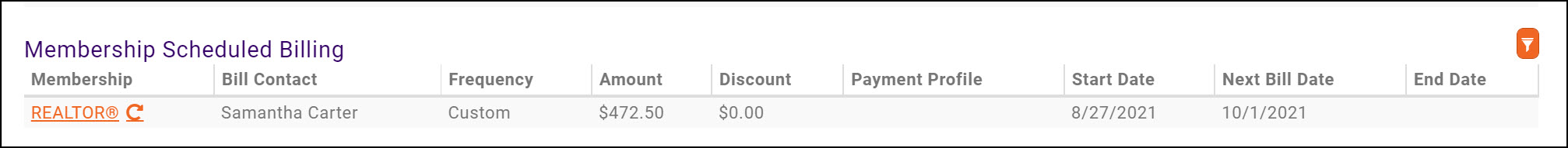 NOTE: The system will use the first bill date in the plan to setup scheduling billing. For example: If the membership is added on 8/27/21, but the plan's first invoice is scheduled for 10/1/2021, the system will not create an invoice. The invoice will be created when you run your upcoming billing for October. The frequency for the membership will be set to custom.
