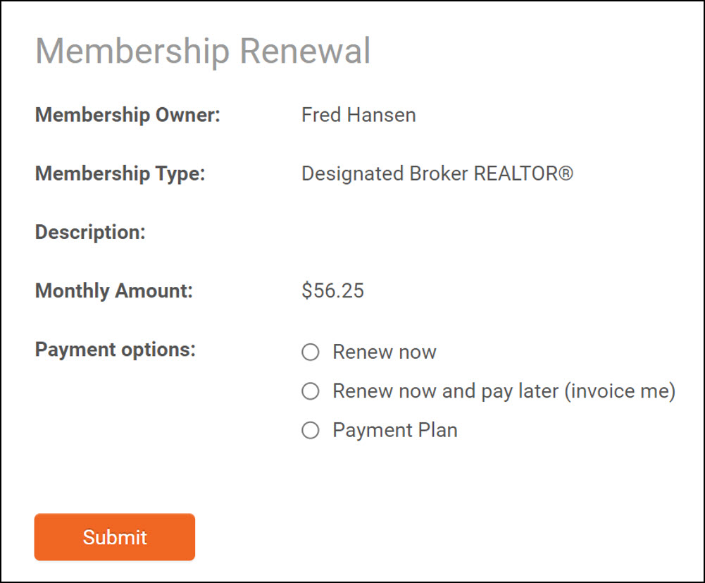 - Renew Now: If this option is selected, the existing frequency will be used to renew the membership. The member will be prompted to enter payment information.