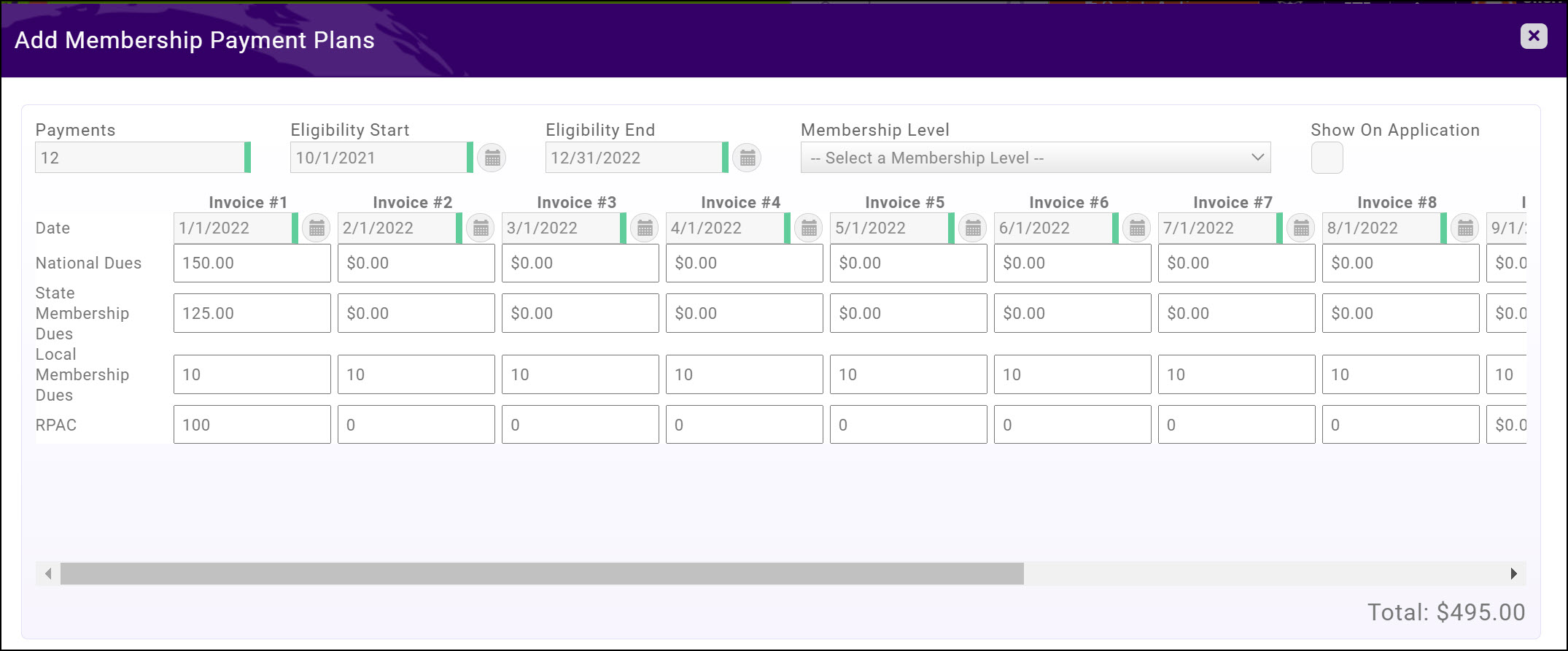 - Define the Eligibility Start and Eligibility End for this payment plan. These dates define when this payment plan may be selected by your members. For example, if the start date is July 1, 2021 and the end date of August 30, 2021, this plan would only be available for selection during these dates. NOTE: If you offer payment plans throughout the term of the membership, you may need to setup multiple payment plans.