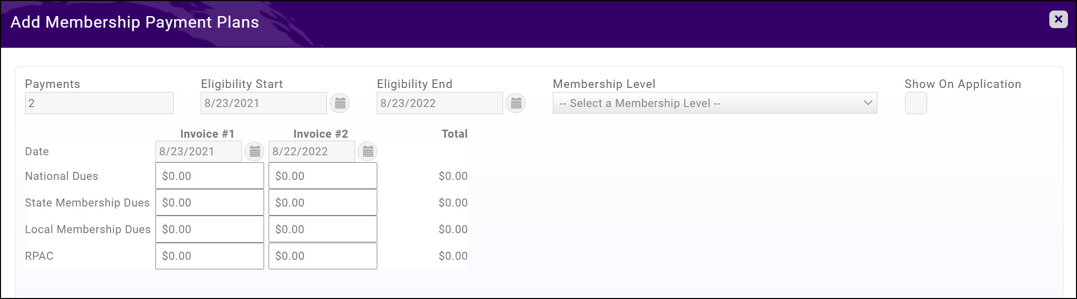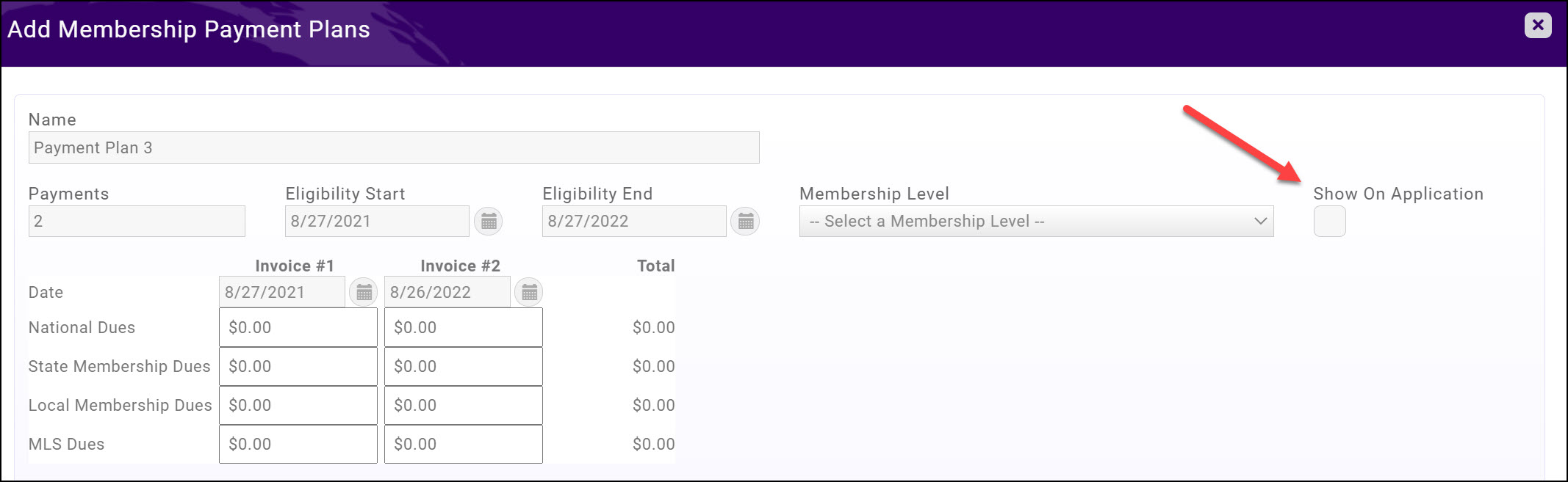 - Click the Show on Application check-box to include this payment option on your application. The plan will only display during the eligibility dates. Caution: When including payment plans on the membership application you need to ensure that the eligibility dates and how you have invoicing setup for the plan meet your financial requirements.