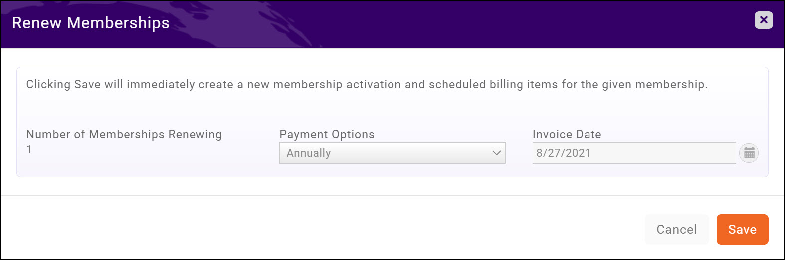 - Click Save. Clicking Save will immediately create a new membership activation and scheduled billing items for the given membership.