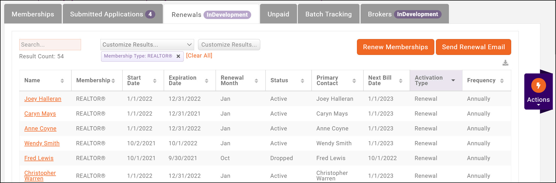 - On the Renewals tab, filter the list to those members without a Next Bill Date.