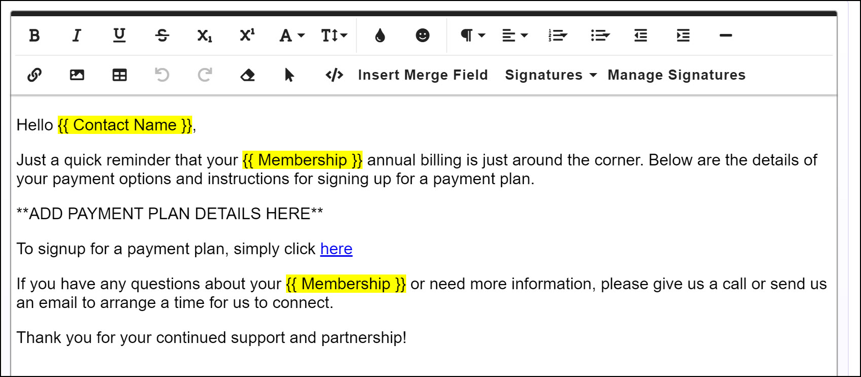 Within in the Memberships module, you can use the Renewals tab to send emails notifying your members that their membership is up for renewal. Even if you are not offering payment plans this function is available as an efficient way to notify your members of upcoming renewals! IMPORTANT! Remember that you have specific eligibility periods for your payment plans. In order for a member to select a payment plan, they must have received the email during that eligibility period. You will want to setup your processes accordingly.