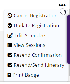 - Print a name badge for this attendee. (You can print bulk badges from the additional actions available to the right of the Add Registration button at the top right of the window)